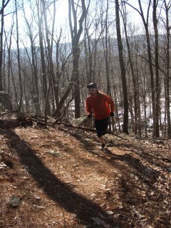 Rick McNulty provided the oral countdown leading precisely into 9AM (apparently he’s consistently punctual about start times) and we were soon rounding Shepherd Lake and heading into the woods. Within a mile or so (after hearing some runners in the chase pack yelling “too fast!” at us) the lead pack had reduced to a trio of Myself, Seth (who looks like Tarzan carrying a camelbak) and Bill Cuthbert. We headed up the initial climb at a staggeringly fast pace, and maintained what to me seemed like a relatively reckless clip through the first aid station (5.6 miles) wherein no one took any aid, and continued through several miles of the next leg until Seth and Bill gained ~200′ on me as Mike Dixon caught up, only for Bill and Seth to miss a turn (which Julian, who was taking pictures eventually reeled in and re-directed).
